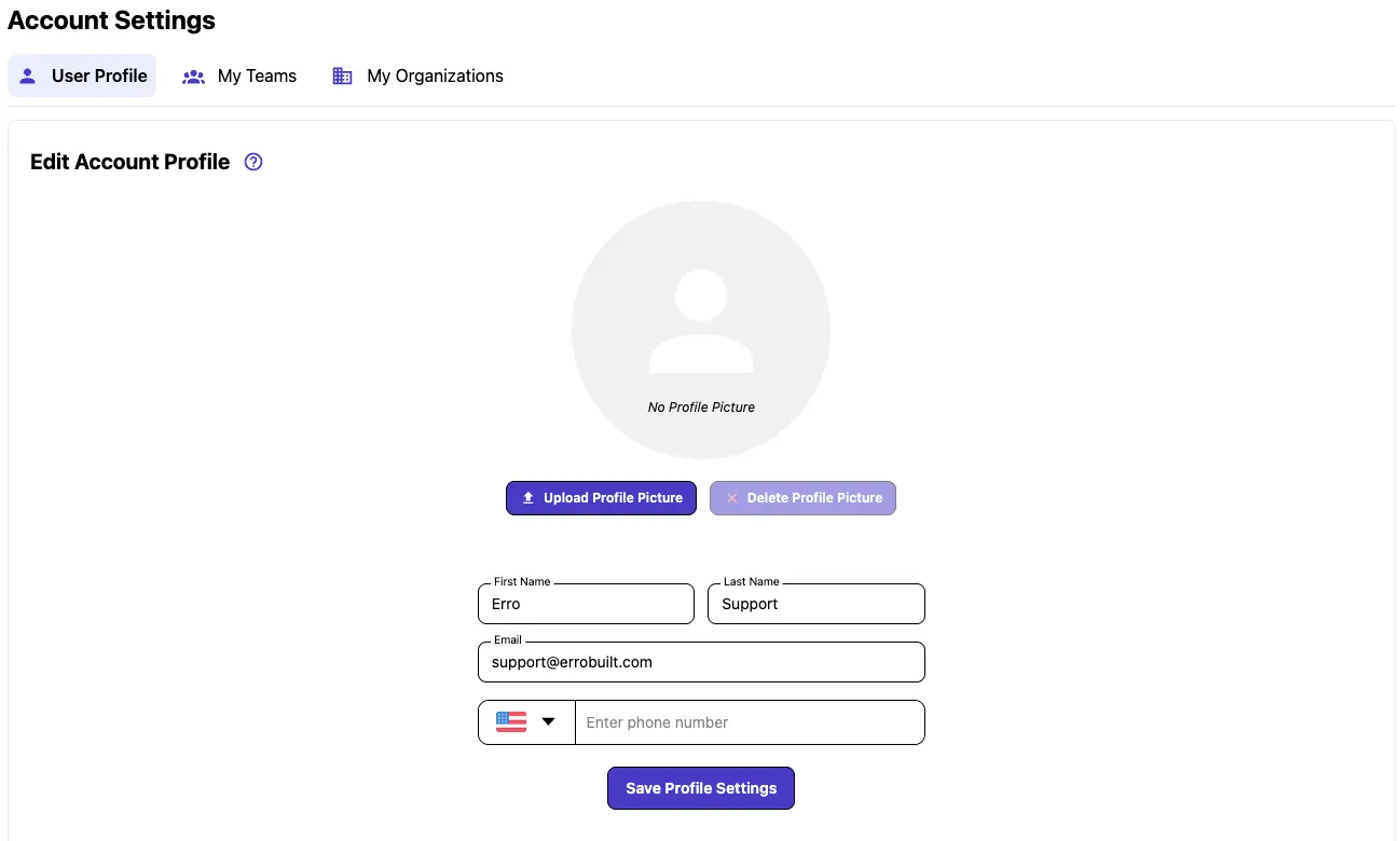 From any page within the Erro app, click on your profile icon or name in the top right corner. This will open a dropdown menu where you can select 'Account Settings' to view and update your account details.