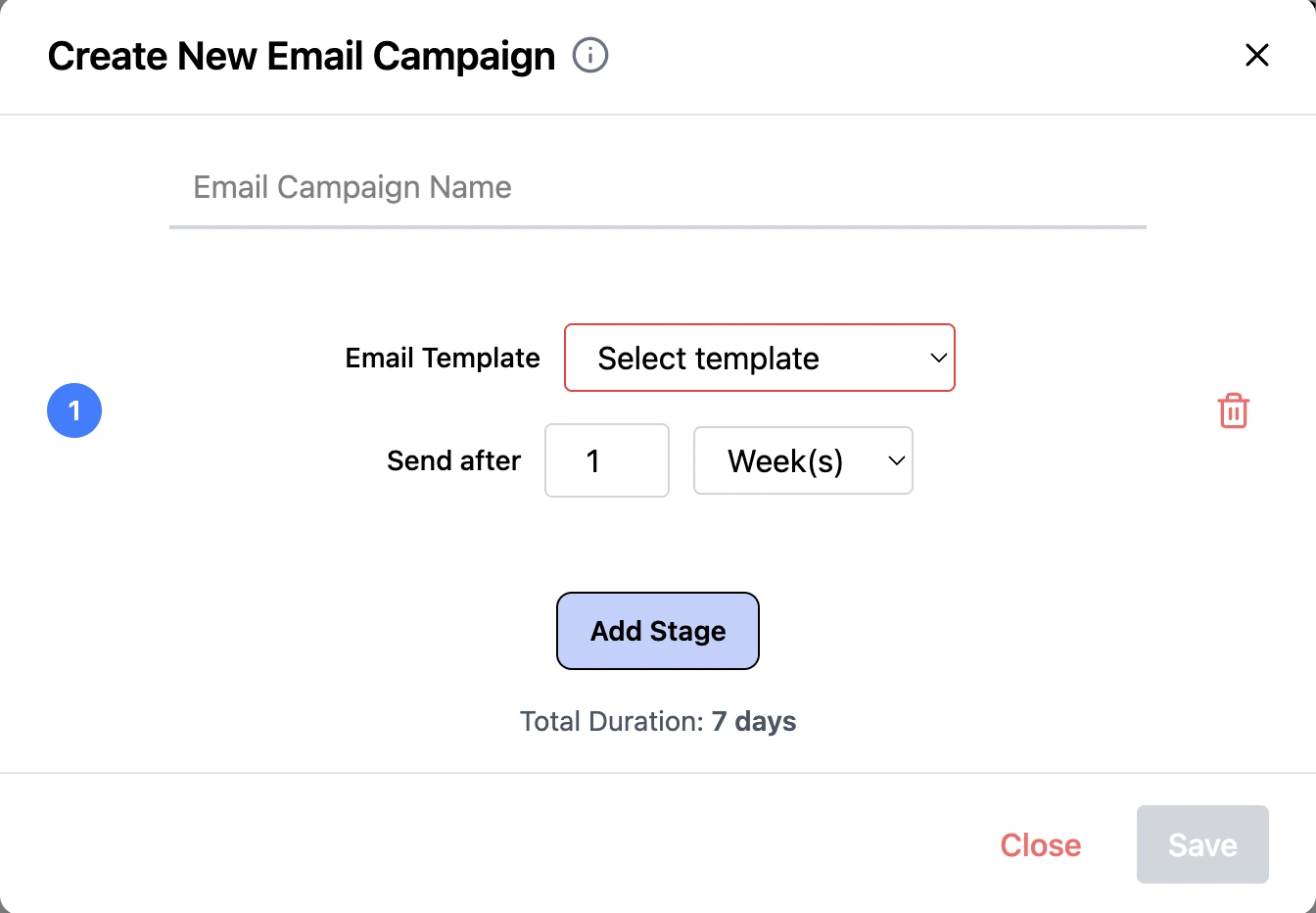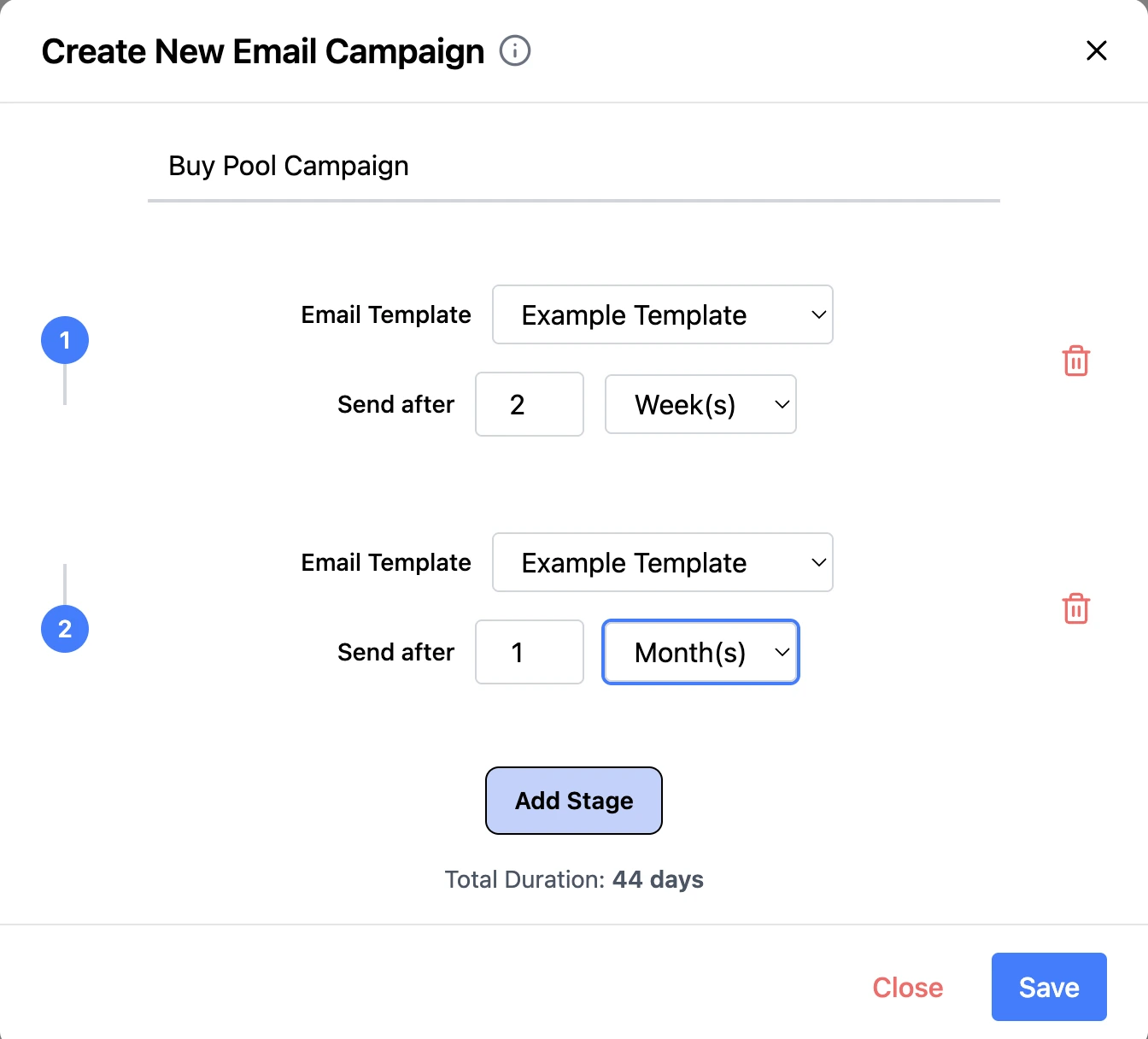 Start by naming your campaign. Use 'Add Stage' to select an email template and define the send frequency for each stage. Continue adding stages to create a complete, multi-step email flow.