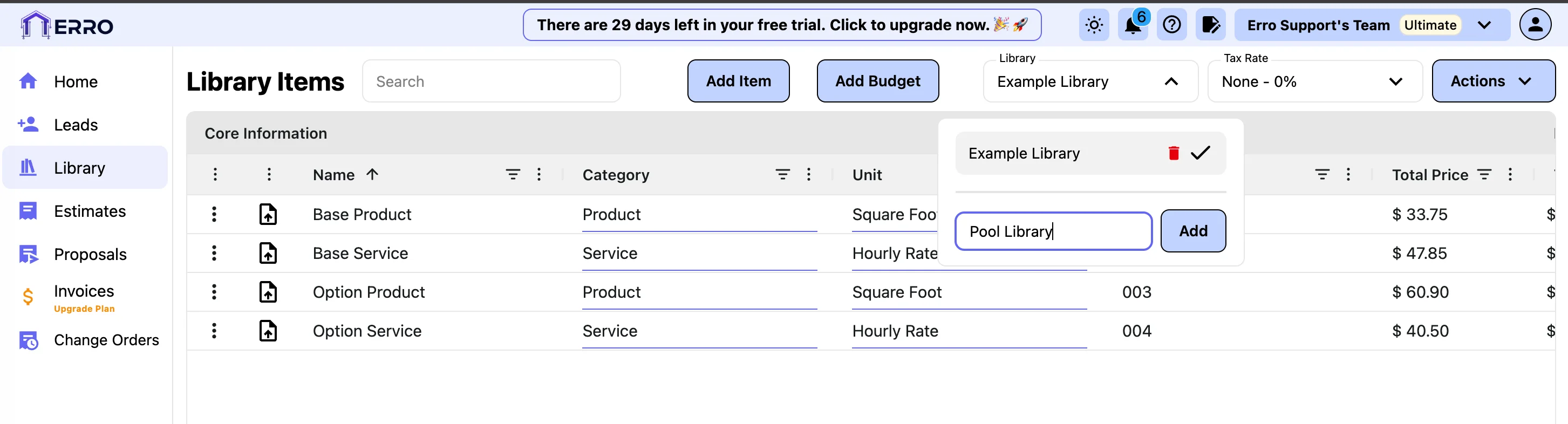 Once the library is created, you can start adding items by clicking the 'Add Item' button. Fill in the item details such as name, photo, category, unit of measure, and item number.